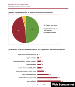 No hay ningún otro dato sobre Cuba en el informe de la encuesta. En cuanto a Venezuela, las opiniones están dividas sobre la intervención de España en la crisis.